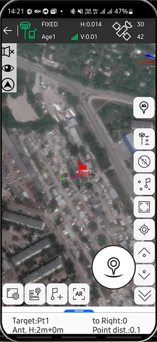 Un módulo láser incorporado que puede recopilar coordenadas sin acercarse al objetivo. La medición láser facilita la medición de los objetivos que no tienen señal GNSS o son inaccesibles.